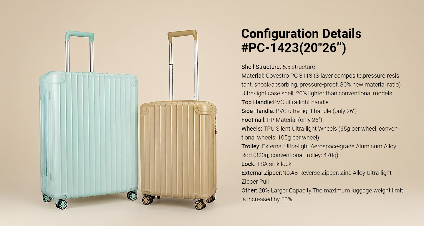 The shell is made of Covestro PC 3113—a 3-layer composite material with 80% new material ratio. It’s pressure-resistant, shock-absorbing, and pressure-proof, while being 20% lighter than conventional luggage shells. This balances ultra-lightweight performance with durability, perfect for daily travel.